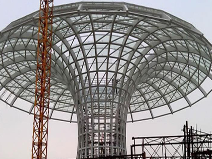 二、球形网架结构因其结构新颖,受力合理,自重轻、用钢量低等优点。如大型体育场馆球形齐齐哈尔螺栓球网架、公共场馆球形网架、电厂齐齐哈尔螺栓球网架、水泥工业球形网架、仓储物流球形网架、齐齐哈尔干煤棚工业球形网架、齐齐哈尔收费站齐齐哈尔加油站球形网架、展览中心、影剧院、商场、航站楼、候车厅、工厂齐齐哈尔车间、仓库、电视塔等球形螺栓球节点网架。国内球形网架结构主要分为:齐齐哈尔焊接球节点网架及螺栓球节点网架两种。螺栓球节点网架其构件工厂内加工量较大,现场安装便捷,适用于现场工期紧,齐齐哈尔施工条件、用电量受制约,网架形状复杂、齐齐哈尔杆件定位困难的异形结构。螺栓球节点球形网架系统基本由齐齐哈尔杆件、螺栓球、支撑支座等组成。按照节点形式可分为交叉齐齐哈尔桁架体系、四角锥体系、三角锥体系等。支撑方式多为固定支座支撑。对于大面积、大跨度及有特殊受力或伸缩要求的网架结构可采用橡胶支座、滑移支座、球铰支座等支撑形式,以满足结构自身的受力稳定、均衡,便于内力释放等设计要求。